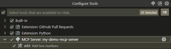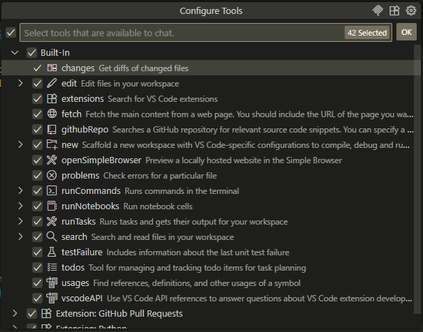 VSCode Copilot 中的 configure tools 面板,可以看到,内置了很多的MCP服务,为大模型提供了 文件编辑(edit)、联网搜索(fetch)、文件管理(new、search)、终端调用(runCommands) 等等功能。