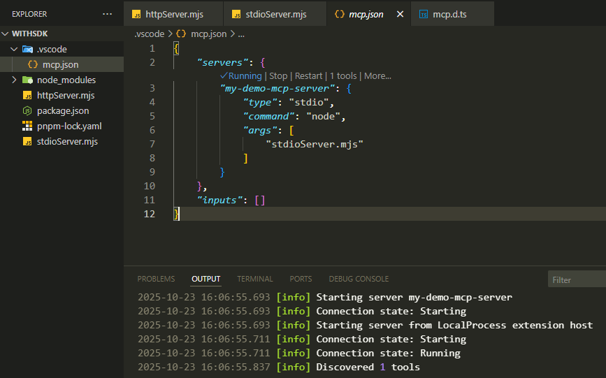 这里我选择本地手动导入我们的 stdio 的MCP服务,点击 running 就跑起来了,可以看到发现了一个 tool