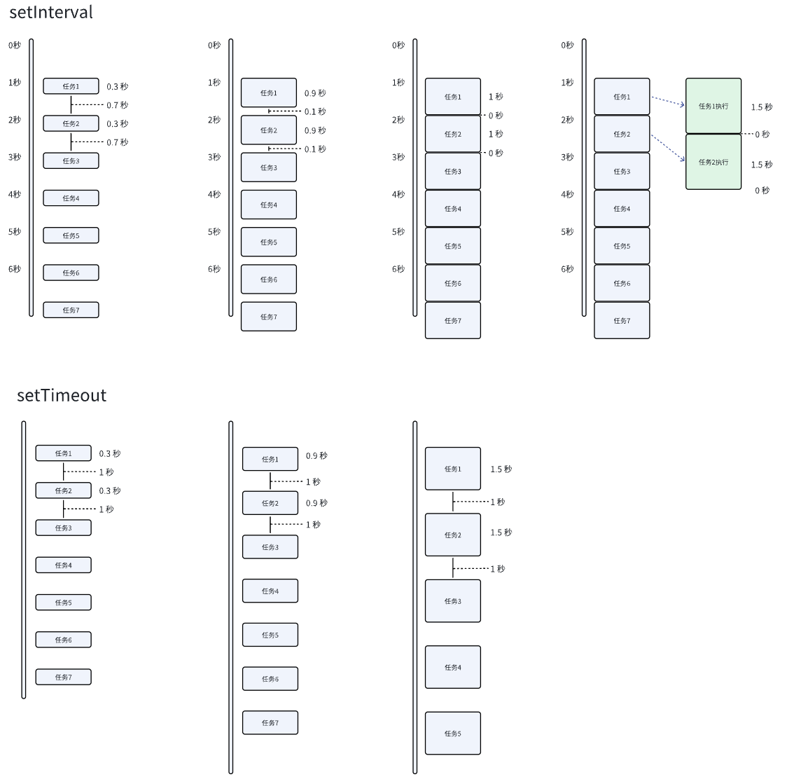 如果需要严格控制两次任务的间隔,那应该使用 setTimeout 去做