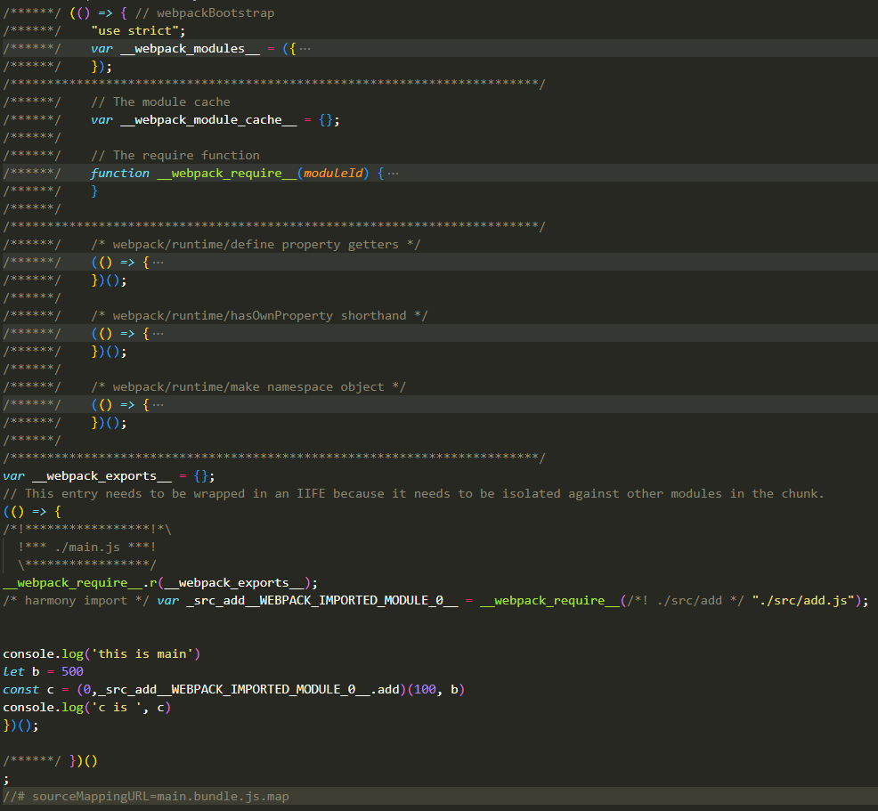npx webpack最终我们得到一个 main.bundle.js,这是一个 dev 模式下的产物,内容比较全