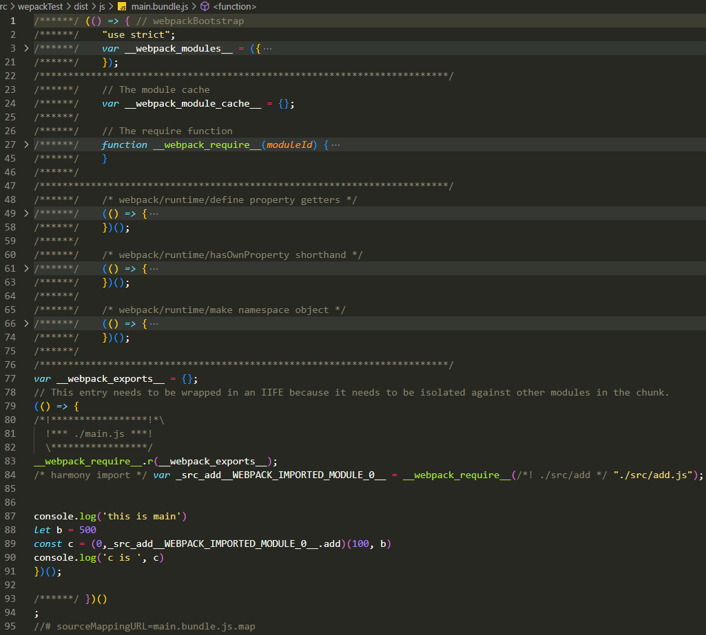 我们两行写好的 add 函数被webpack包成了用 webpack 的 module\export\require 的方式,去除注释长这样。
