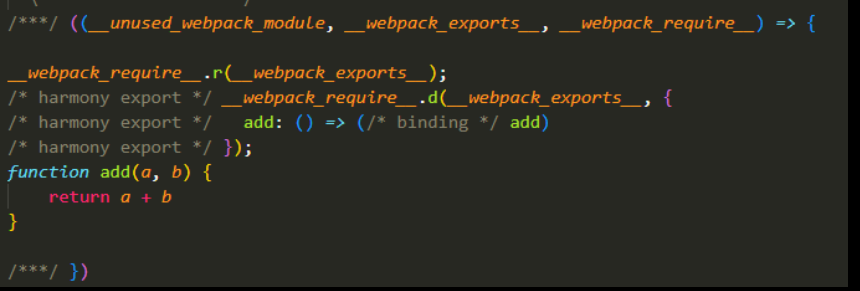 __webpack_require__.r(__webpack_exports__);// 标记export为ESM__webpack_require__.d(exports, {add: ()=> add});// 把 add 函数用 getter 访问器加到 exports 上,函数执行完毕- 回到