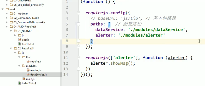 结合 requirejs.config 去配置模块名字和文件的映射。